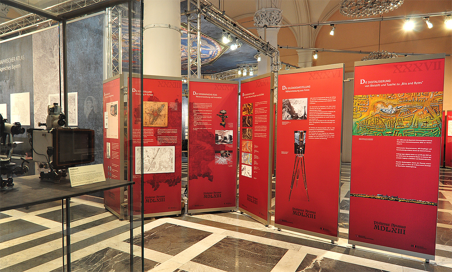 Die Ausstellung der Bayrischen Vermessungsverwaltung in Zusammenarbeit mit der Bayrischen Staatsbibliothek erinnert an Apians Pioniertat und zeigt, wie es danach weiterging: vom “Topographischen Atlas des Königreiches Bayern“ bis zum BayernAtlas.