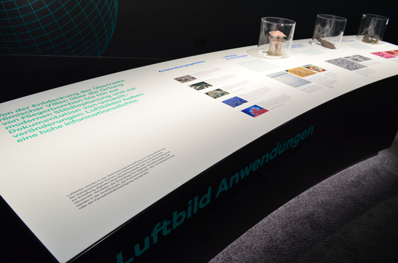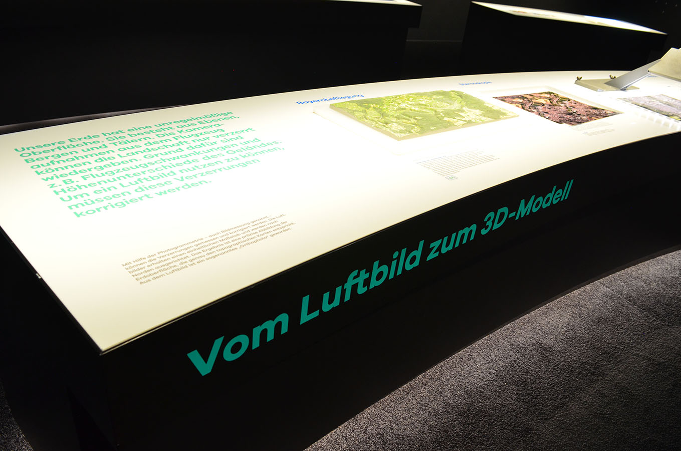 An der Recherchestation können Luftbilder aus ganz Bayern aufgerufen werden. Dabei werden Veränderungen von Landschaften und Städten gut sichtbar. Ein virtueller Flug über die Zugspitze, der Blick durch eine Anaglyphenbrille oder durch ein Stereoskop machen deutlich, wie Gebäude und Landschaften in Luftbildern zu dreidimensionalen Objekten werden.