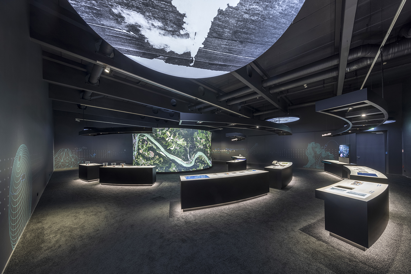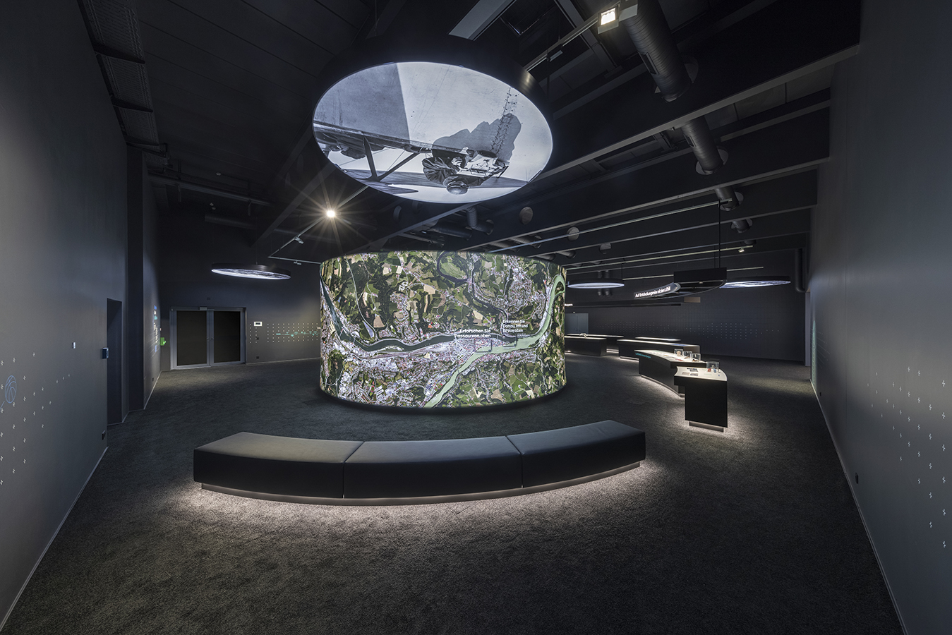 Im Zentrum der Ausstellung leuchtet der Nukleus mit einer riesigen Luftbildkarte. Diese Karte ist 18 Meter lang und kann virtuell erkundet werden. Im Inneren des Nukleus werden Luftbilder aus einem Zeitraum von über 100 Jahren gezeigt.